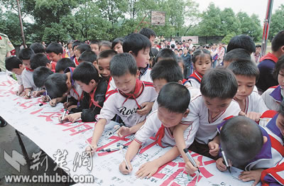 圖為鄂州市桐城小學(xué)學(xué)生踴躍簽名爭做遵守交通法規(guī)好學(xué)生。