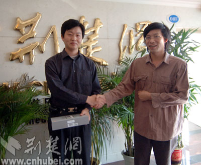 荊楚網(wǎng)24日訊 記者艾丹 潘頔 報(bào)道:23日抽出的“讀報(bào)紙、發(fā)短信、中手機(jī)”活動(dòng)的兩位幸運(yùn)獲獎(jiǎng)?wù),武漢的李先生和谷城的孟先生,今天下午來到荊楚網(wǎng)領(lǐng)獎(jiǎng),荊楚網(wǎng)總編輯閻思甜親自為他們頒獎(jiǎng)。