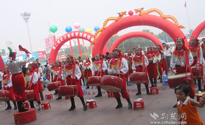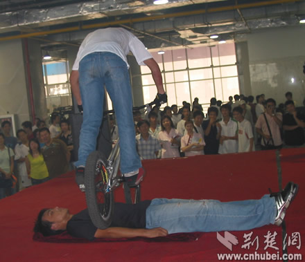 武漢市首屆時尚體育博覽會開幕式現(xiàn)場來自硚口區(qū)漢水橋街威風鑼鼓隊在開幕式上進行精彩的表演賽車俱樂部的車手和車模亮相東方神馬騎士俱樂部漂亮神氣的女騎士健身教練在進行健身表演極限單車高手有驚無險的表演