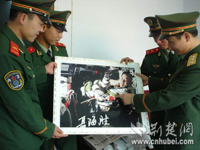 昨日,武警襄樊市支隊官兵來到航天英雄聶海勝家中,慰問聶媽媽,踏訪英雄的成長足跡。從墻上取下聶家珍藏的聶海勝的照片,武警官兵無不為這個戰(zhàn)友自豪。