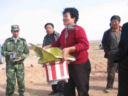 記者在搜索現(xiàn)場(chǎng)看到,從四面八方趕來(lái)的牧民群眾個(gè)個(gè)都有所獲!肮,人們常說(shuō)天上掉餡餅,這不應(yīng)驗(yàn)了?”牧民張金虎指著自己撿到的一堆殘骸,興奮地開(kāi)著玩笑。牧民烏云還向記者炫耀,她和丈夫?yàn)趿裉焯匾馄鹆藗(gè)大早,在家焚香默默祝愿神舟六號(hào)飛船試驗(yàn)成功,所以今天他們撿到的殘骸最多,能裝滿滿一車。
