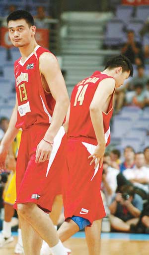 第二節(jié)還有9分13秒時(shí),姚明上場(chǎng),明郅組合終于出現(xiàn)。姚明打內(nèi)線,王治郅打外線,兩人難有很好配合。巴西隊(duì)以44比38結(jié)束上半場(chǎng)。