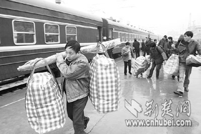停靠10分鐘后,這趟民工專列駛離武昌站,于昨晚20時20分到達襄樊。據(jù)武昌站介紹,節(jié)前的民工專列多從南方發(fā)往武漢,節(jié)后武漢鐵路局將加開大量南下、東進的民工專列。