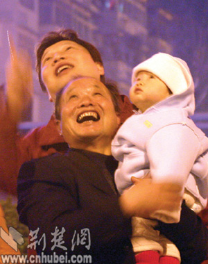 漢陽的劉春華一大家子人特別引人注目,因?yàn)樗麄優(yōu)榇蠡镎故玖艘粓?chǎng)小型的私人焰火晚會(huì)。她的四兄弟姊妹,從面包車上扛下大包大包箱子般大小的焰火,依次在江邊擺開。不一會(huì),幾道彩色的光柱就在天空閃耀,彩色幕布被拉開。震耳的轟響,讓孩子們又愛又怕,躲在父母的身后偷偷地捂著耳朵跳鬧。70多歲的爺爺奶奶微笑著,安靜地看著自己十多個(gè)子子孫孫們歡暢的一幕。