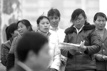 在武漢2007春季首場(chǎng)農(nóng)民工招聘會(huì)上,幾位來(lái)自黃梅的農(nóng)民工在私下討論:“今年招工才剛開(kāi)始,要先比較哪家更好。”