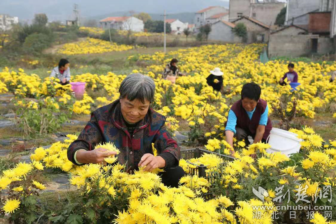 荊楚網(wǎng)(湖北日?qǐng)?bào)網(wǎng))訊(通訊員李暢)11月12日,初冬的太陽暖暖融融的,在大悟縣四姑鎮(zhèn)同興村金絲皇菊種植基地,農(nóng)民正在采摘豐收的菊花。百畝菊花競(jìng)相開放,耀眼奪目。漫山遍野,金燦燦、一簇簇,吸引不少游人前來觀賞拍照,成為來四姑鎮(zhèn)賞紅葉的又一處“網(wǎng)紅打卡地”。