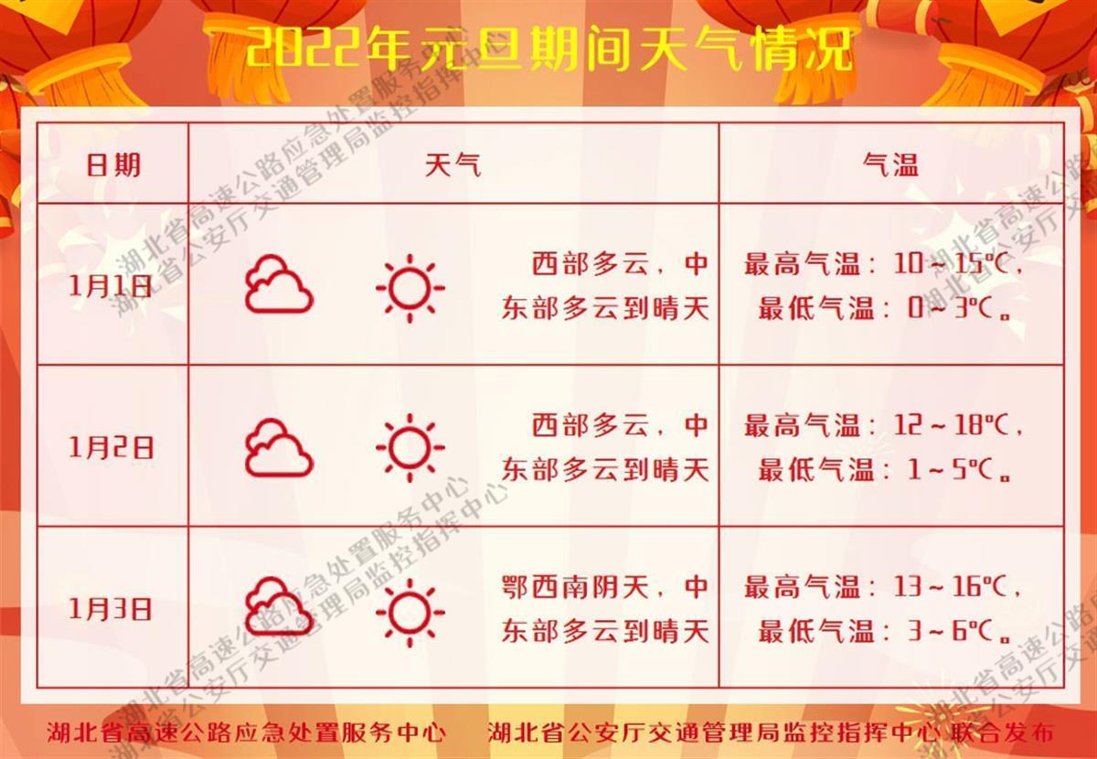 據(jù)最新氣象資料綜合分析,預(yù)計(jì)2022年元旦假期期間(1月1日至3日),湖北省西南部為多云天氣,中東部以多云到晴天氣為主,天氣總體利于出行。