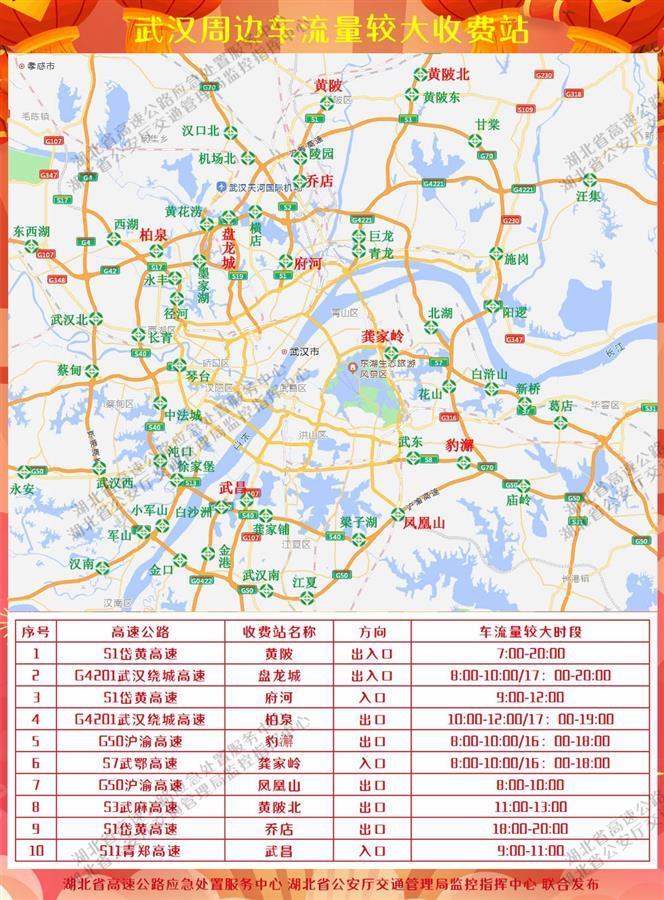 預(yù)計(jì)元旦期間,全省高速公路重點(diǎn)通道的車流量將顯著上升,國高網(wǎng)路段及武漢市周邊重點(diǎn)收費(fèi)站易發(fā)生緩行情況。具體易緩行路段和武漢周邊車流量大收費(fèi)站如圖所示: