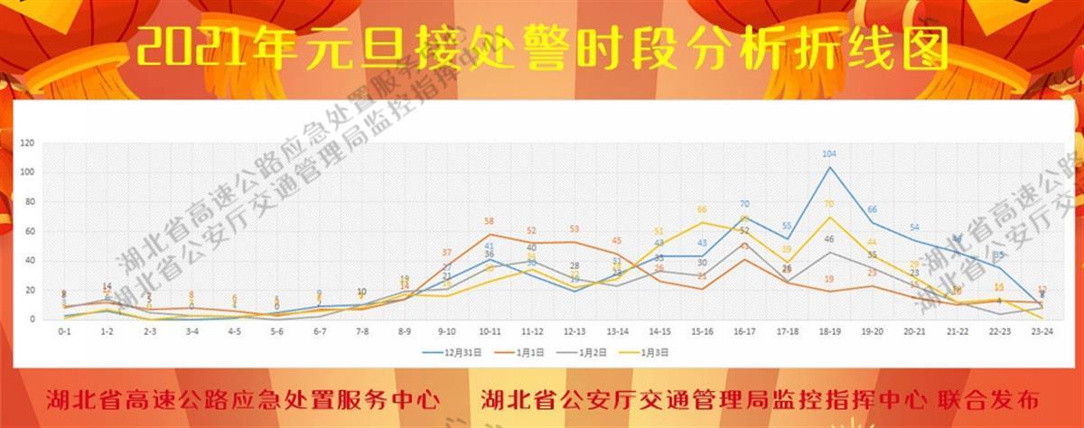 根據(jù)湖北省公安交管局監(jiān)控指揮中心對2021年接警統(tǒng)計(jì)歷史數(shù)據(jù)分析,從元旦假期警情時(shí)段分布來看,警情高峰期多發(fā)生于12月31日16時(shí)至20時(shí),節(jié)日期間8時(shí)至12時(shí)、14時(shí)至18時(shí);警情數(shù)量與交通流量成正比。