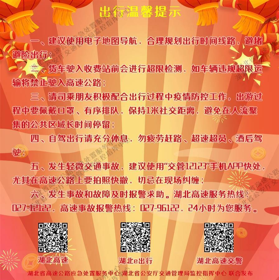 湖北省交通運(yùn)輸廳高速公路管理局建議廣大公眾提前合理安排出行線路,科學(xué)避開擁堵路段,出行途中也可使用各類導(dǎo)航軟件,隨時(shí)關(guān)注“湖北高速”“湖北e出行”微信公眾號、微博發(fā)布的信息,或撥打027-12122湖北高速服務(wù)熱線了解路況。