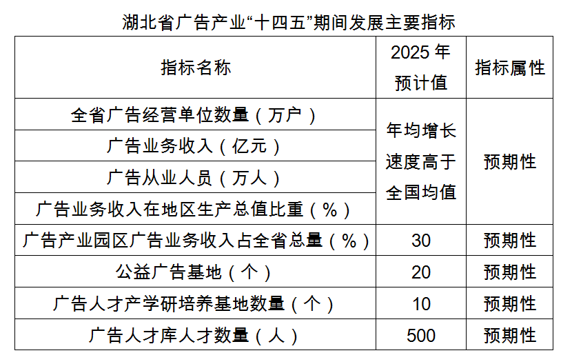 到2025年,預期全省廣告經(jīng)營單位、業(yè)務收入、從業(yè)人員數(shù)量等關鍵性指標年均增長速度高于全國,廣告業(yè)務收入在地區(qū)生產(chǎn)總值中的比重超過全國均值,廣告產(chǎn)業(yè)園區(qū)廣告業(yè)務收入等關鍵性指標達到全省總量30%以上,建設公益廣告基地20個,廣告人才產(chǎn)學研培養(yǎng)基地 10個,全省廣告人才庫人才達到500人。