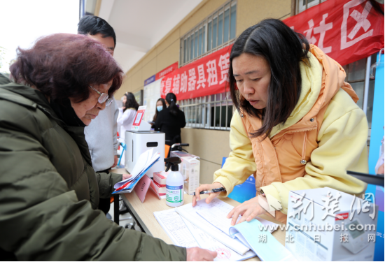 在武漢關(guān)東街道江南社區(qū)一困難老人家中,老人正高興地聆聽(tīng)康復(fù)輔助器具惠民租賃政策。