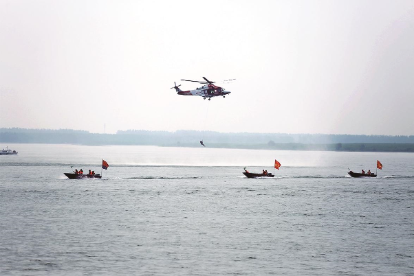 石首長江防汛搶險綜合演練,開展直升機水域救援。