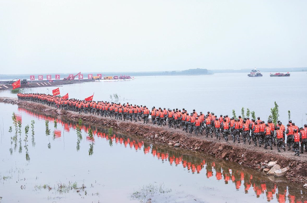 長江防汛搶險綜合演練現(xiàn)場,武警官兵前往險情位置進行處置。