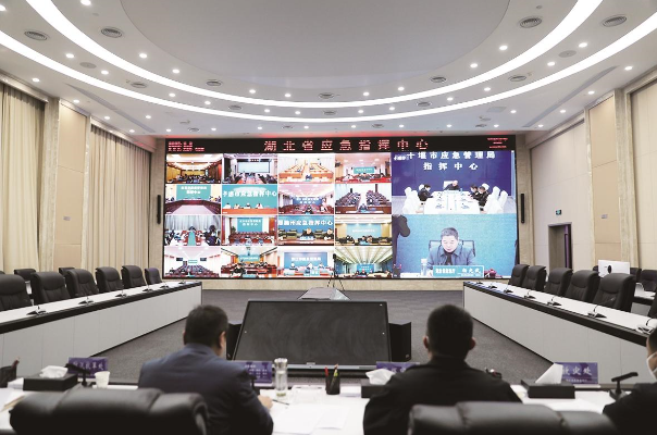 湖北省應急管理廳應急指揮中心,通過視頻連線各級應急指揮中心和救援隊伍。