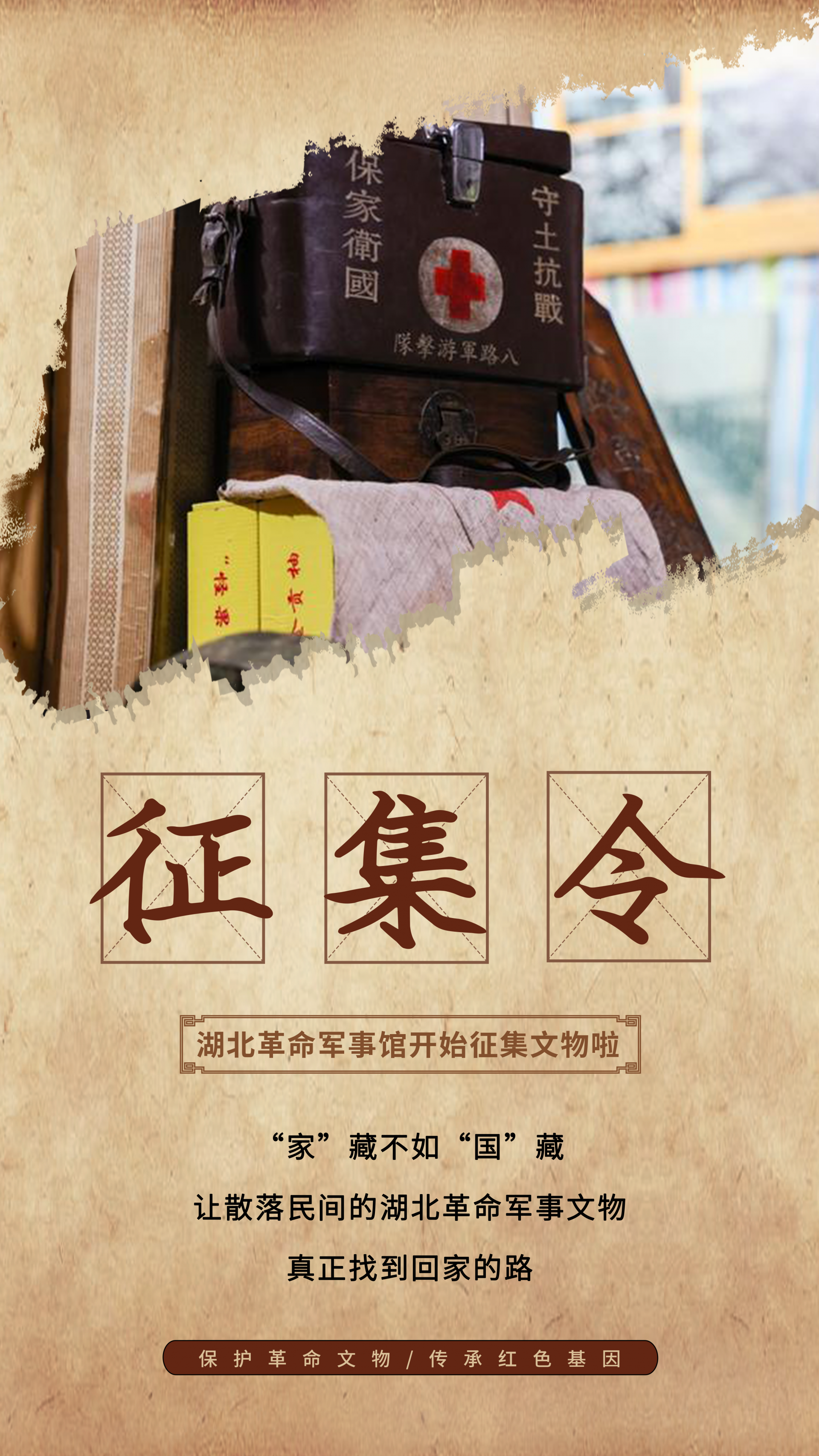 為貫徹落實習(xí)近平總書記關(guān)于傳承紅色基因的重要指示精神,高標(biāo)準(zhǔn)做好湖北革命軍事館籌建工作,集中展示中國共產(chǎn)黨在湖北領(lǐng)導(dǎo)武裝斗爭史、新中國國防建設(shè)史和新時代強軍興軍偉大實踐,延伸展示軍事歷史文化、兵要地志和武器裝備,精心打造傳承紅色基因、宣揚強軍成就、普及國防教育的紅色殿堂,根據(jù)建館工作需要,湖北革命軍事館現(xiàn)面向社會各界公開征集革命文物(實物)史料。