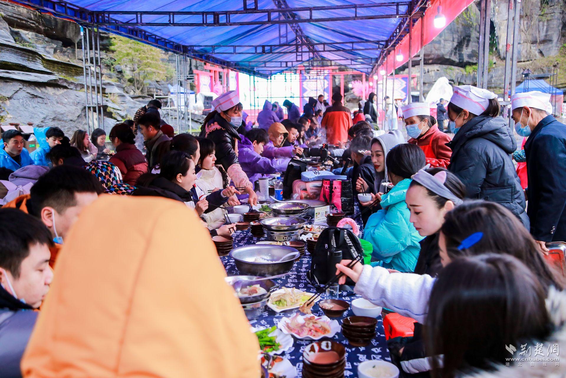 鐵甲寨廣場上長桌蜿蜒,如長龍盤旋,千余人共賞美景,同享美食,芳香四溢的土家特色菜讓人垂涎欲滴,嘉賓及游客們在欣賞非遺展演的同時大快朵頤,現(xiàn)場“網(wǎng)紅達人”不禁撐起自拍桿,在直播間分享這一魅力時刻。