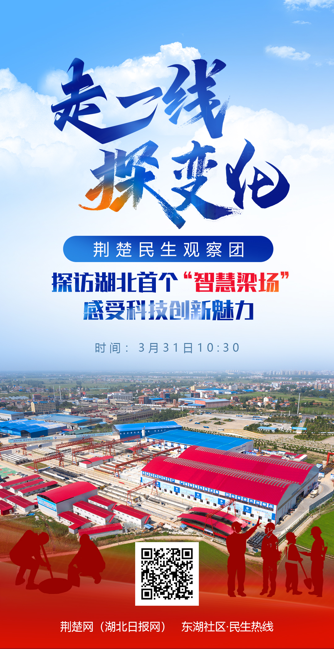 3月31日上午10:30-12:00,荊楚網(wǎng)主播將帶領(lǐng)荊楚民生觀察團(tuán)走進(jìn)湖北孝漢應(yīng)高速公路項目工地,探訪湖北首個“智慧梁場”,近距離參觀箱梁施工工藝流程,感受科技創(chuàng)新魅力。屆時,荊楚網(wǎng)客戶端將進(jìn)行現(xiàn)場直播,歡迎掃碼觀看。