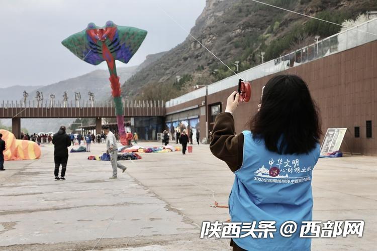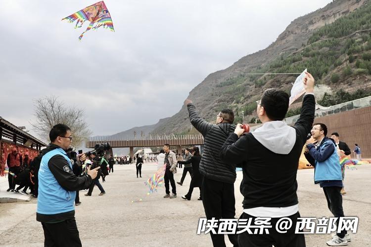 媒體記者在壺口瀑布岸邊體驗放風(fēng)箏。