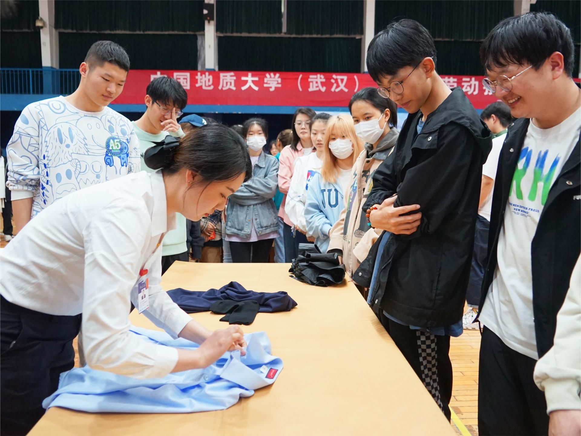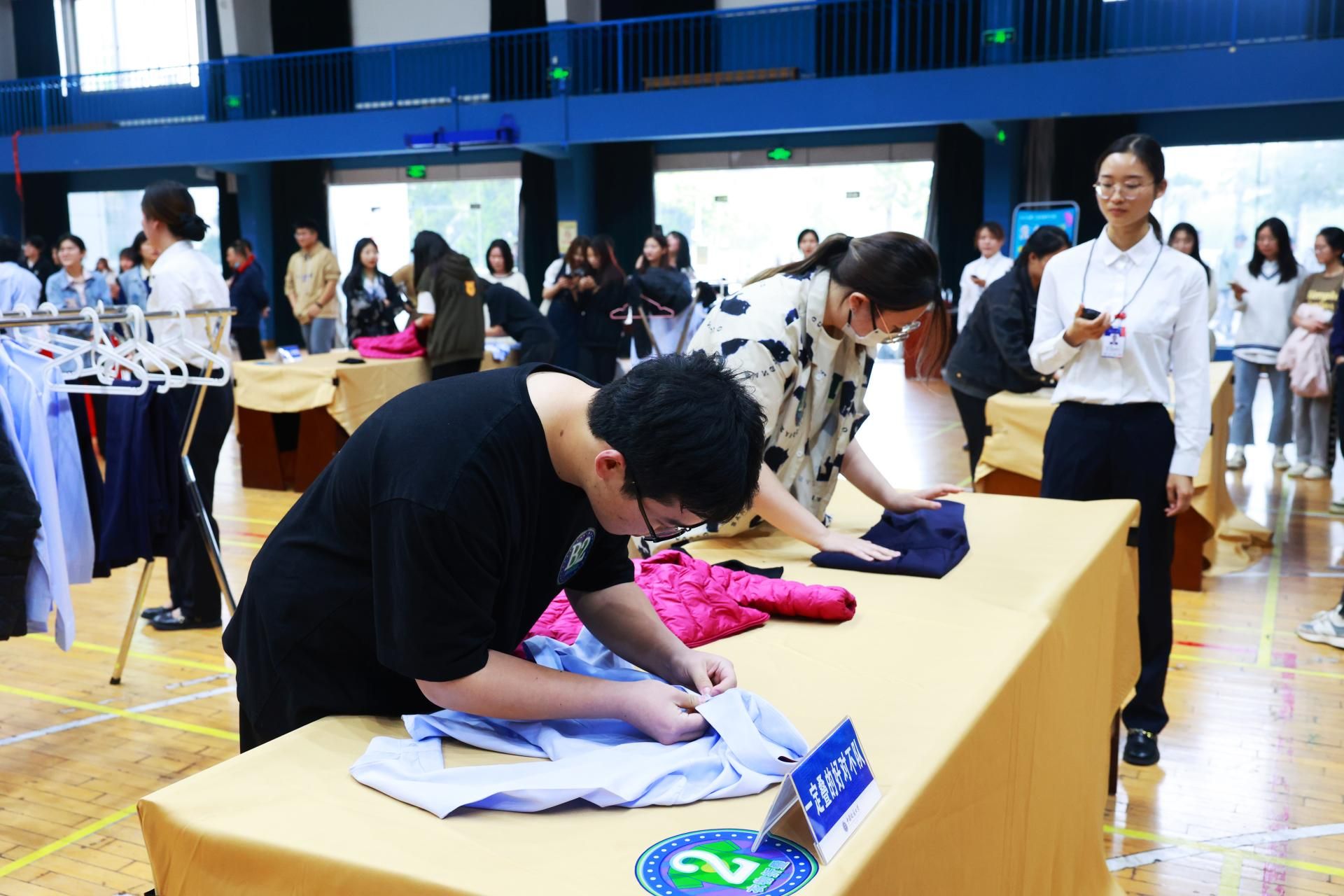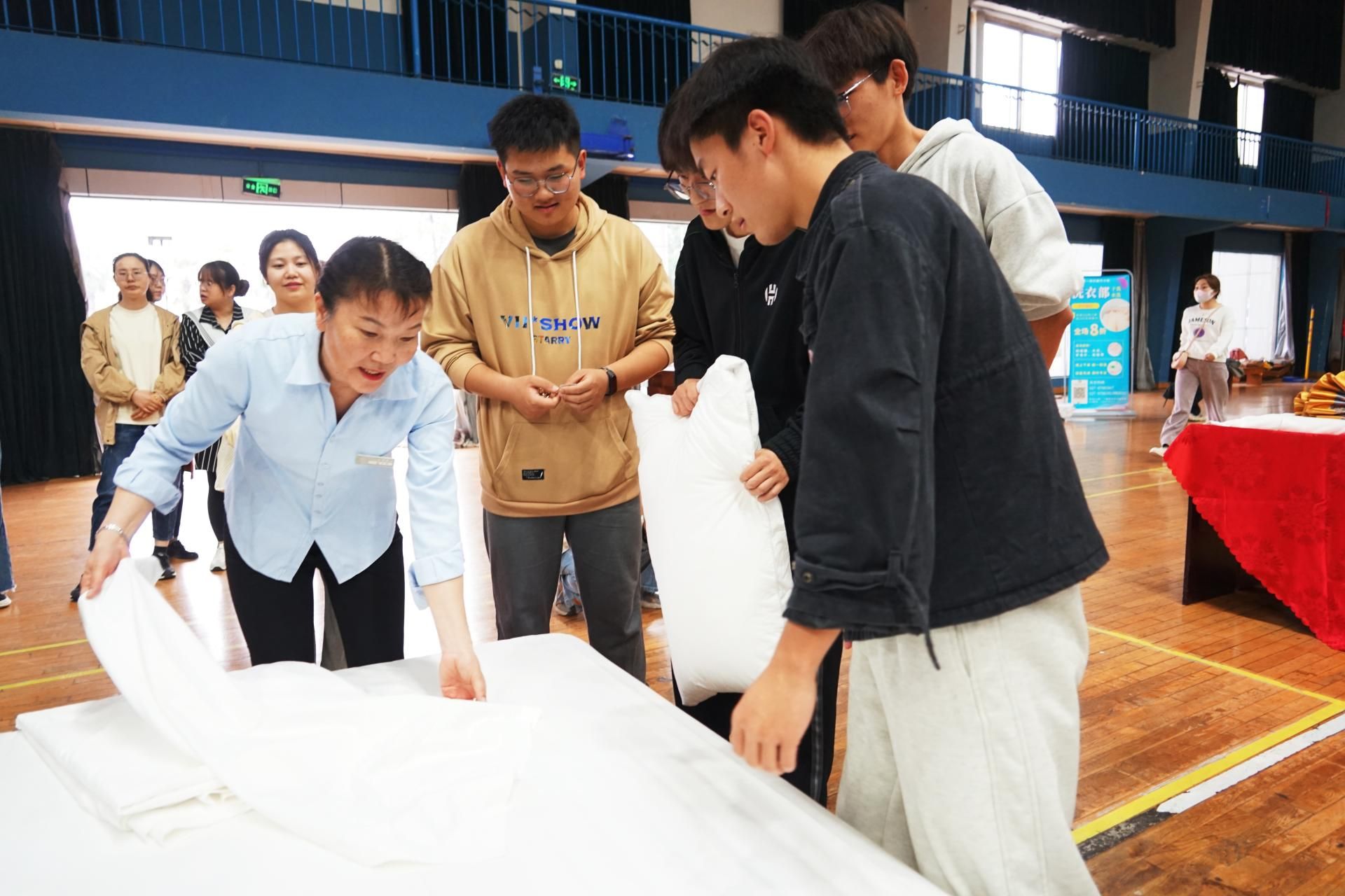 “哇,平時覺得好難的套被子這么容易就完成了”“整套動作也太快了吧,我都不敢眨眼睛,生怕錯過了一個環(huán)節(jié)”“襯衣居然能疊成方塊?!也沒有想象中那么難啊”……在觀看展示環(huán)節(jié),工作人員的專業(yè)度和熟練度讓同學(xué)們驚嘆不已,鼓掌聲不絕于耳。