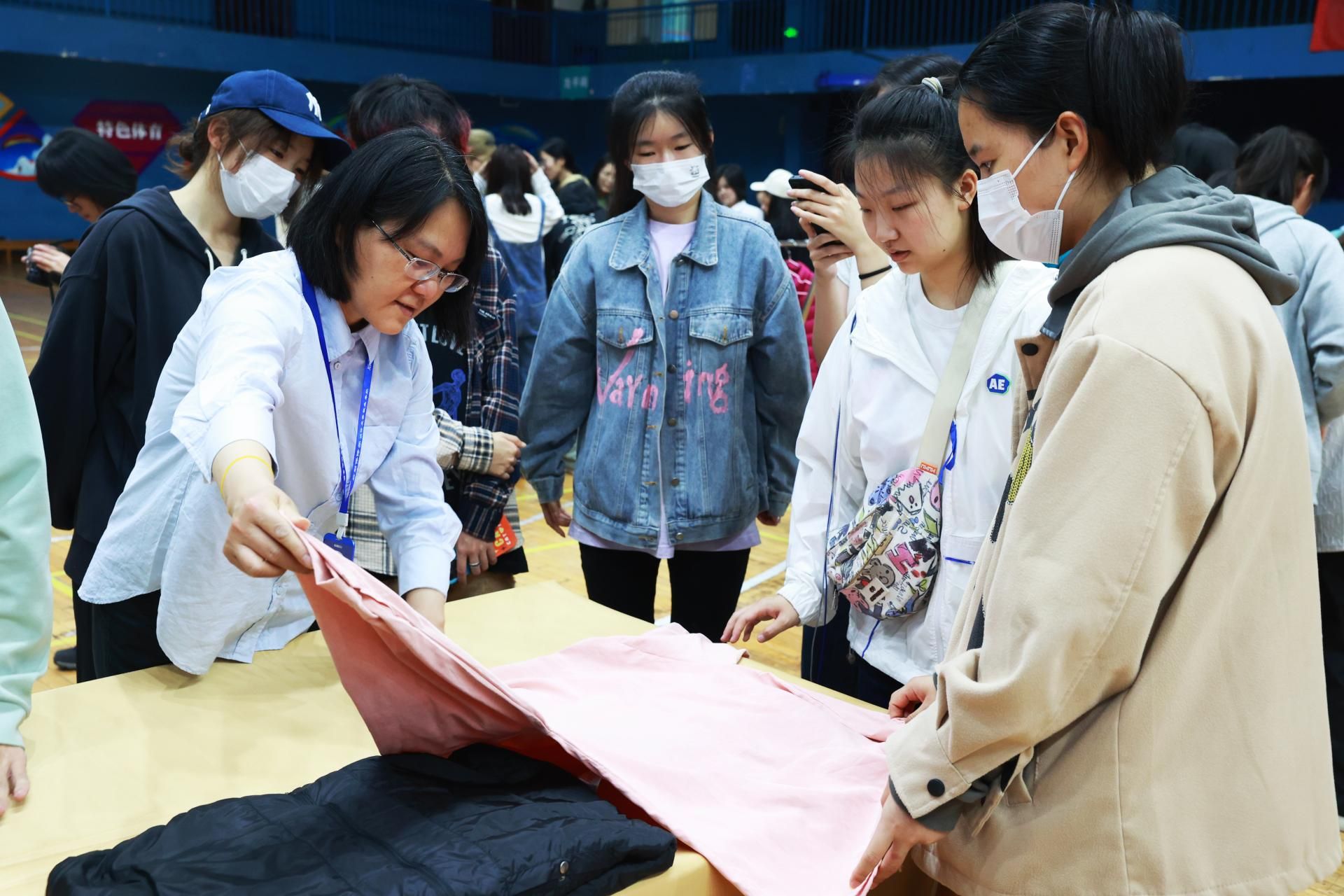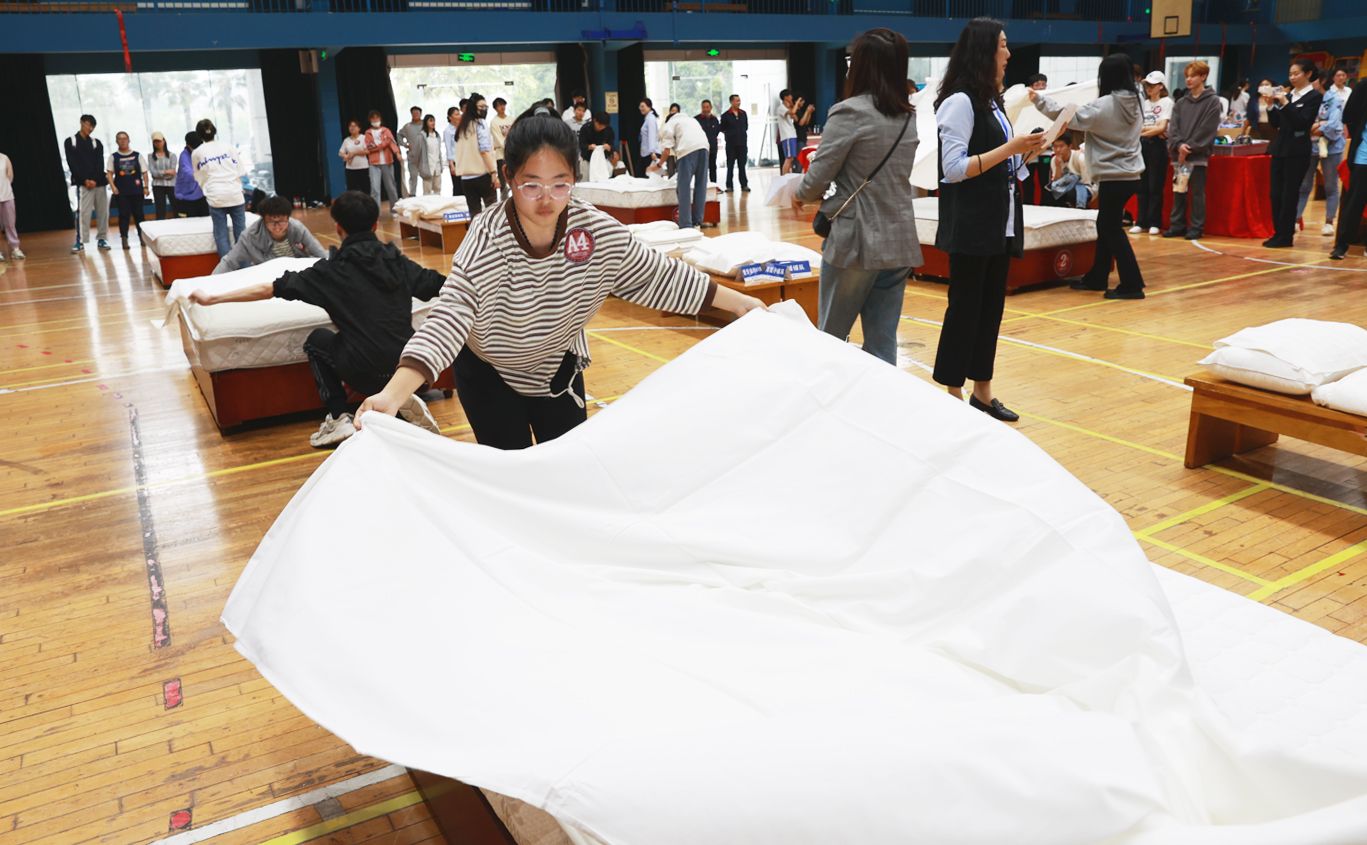 學(xué)習(xí)實(shí)踐環(huán)節(jié),同學(xué)們紛紛摩拳擦掌,上手學(xué)習(xí)鋪床單、套被子、疊羽絨服、疊襯衣等各類房間整理生活技巧。盡管屋外細(xì)雨綿綿,室內(nèi)卻熱火朝天。