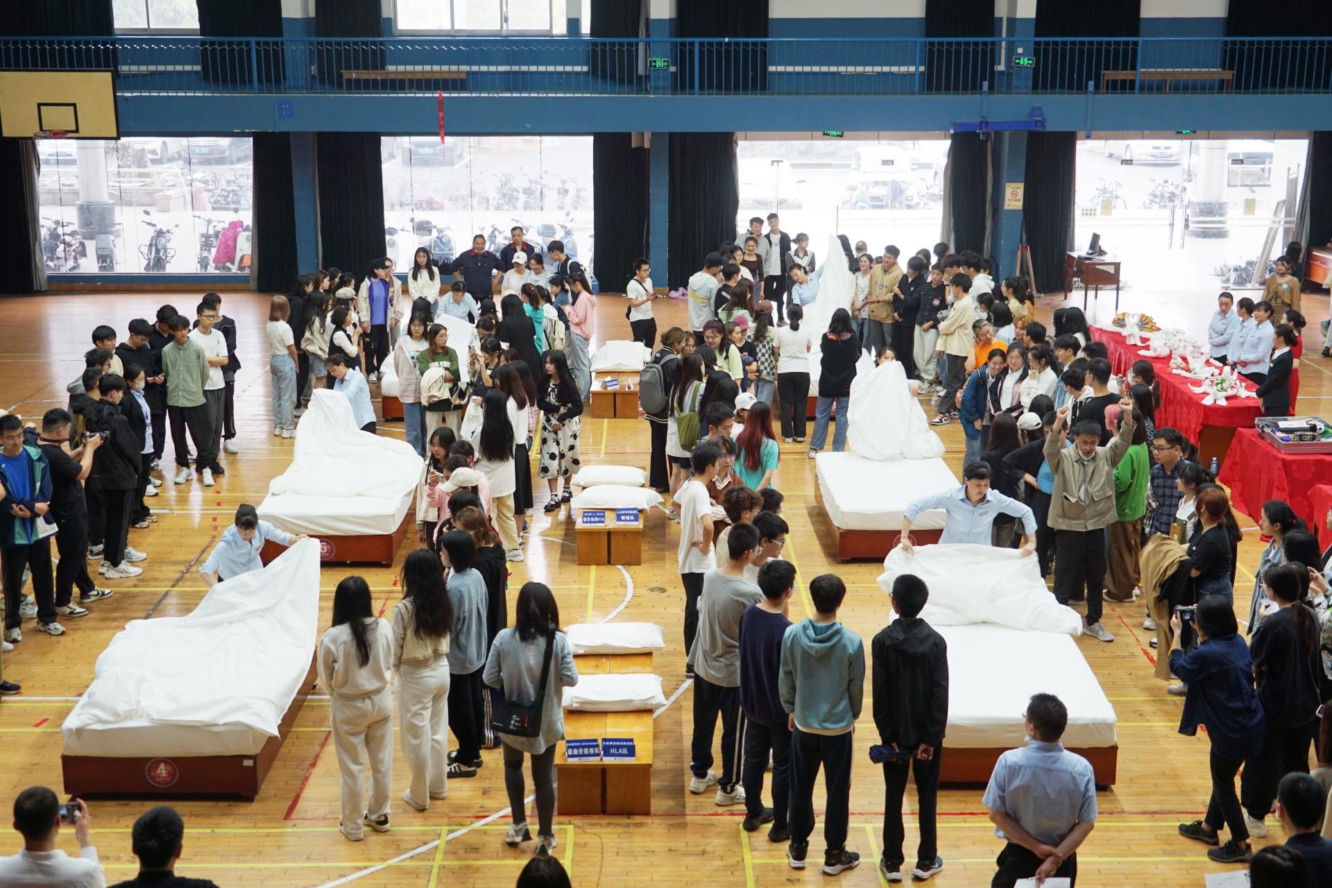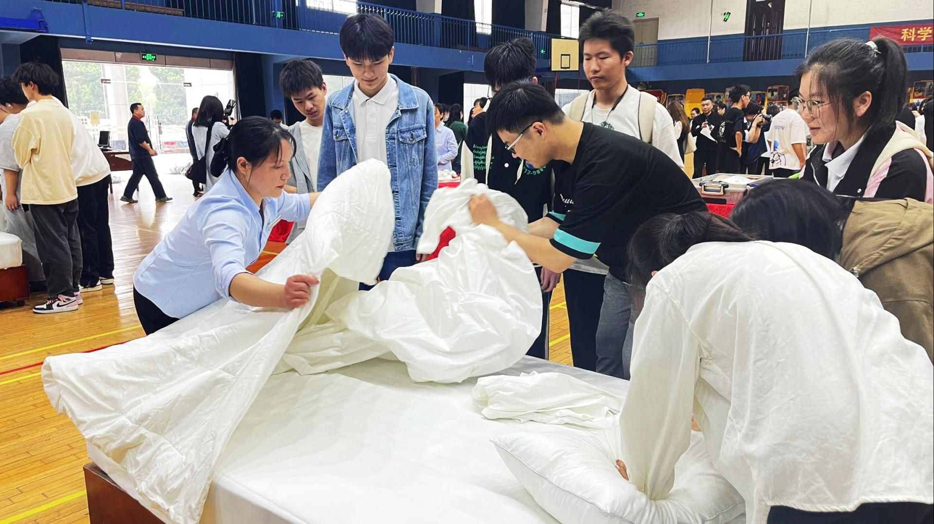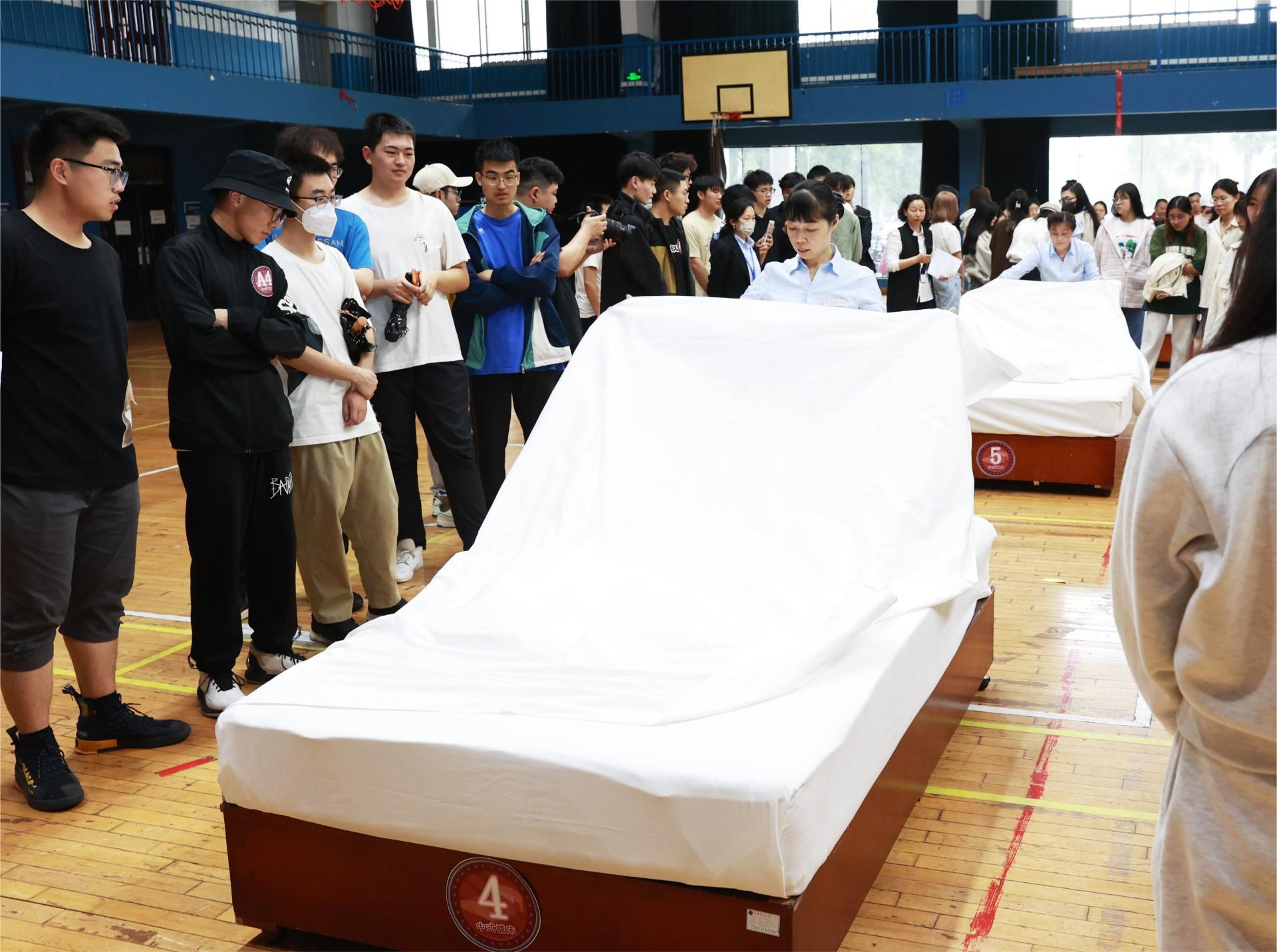比賽設(shè)置中式鋪床及衣物折疊兩個項(xiàng)目,先由后勤保障部工作人員進(jìn)行示范講解,同學(xué)們觀摩后動手實(shí)踐,最后現(xiàn)場比賽,現(xiàn)場氣氛非常熱烈。