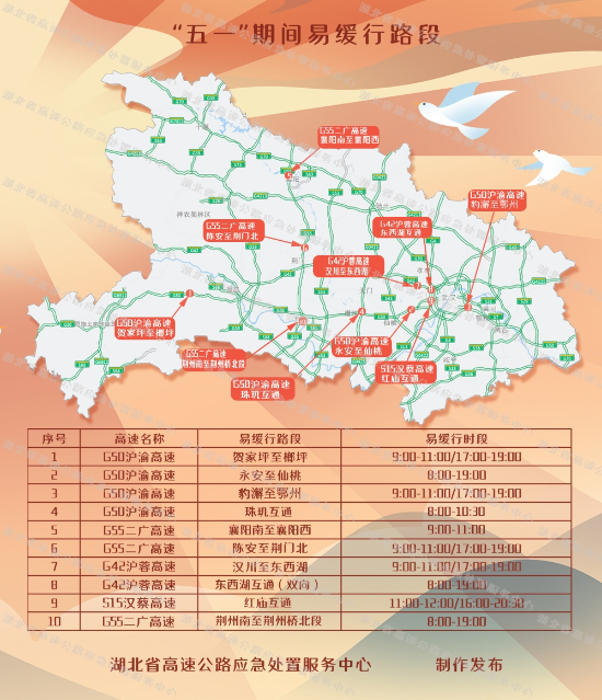 湖北省高速公路應(yīng)急處置服務(wù)中心對(duì)近年來(lái)“五一”期間路網(wǎng)運(yùn)行監(jiān)測(cè)數(shù)據(jù)分析預(yù)測(cè),4月29日出行車流主要由城市向周邊縣市擴(kuò)散,5月2日、3日返程車流向城市匯集,易緩行路段如下圖所示: