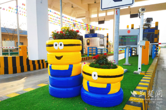 盡覽服務(wù)區(qū)文化風(fēng)光的同時,湖北收費(fèi)站同樣不遑多讓。隨岳高速鹿頭收費(fèi)站上方懸掛了無數(shù)藍(lán)色小燈泡,夜間猶如點(diǎn)點(diǎn)閃爍的“星光”,吸引不少游客在此拍照“打卡”。隨岳高速洋梓收費(fèi)站在運(yùn)用了“彩虹車道”的基礎(chǔ)上,充分利用低成本的廢舊輪胎、小木板、線型燈帶進(jìn)行網(wǎng)紅造景,一件件生機(jī)勃勃的“藝術(shù)品”在安全島頭“閃亮登場”。