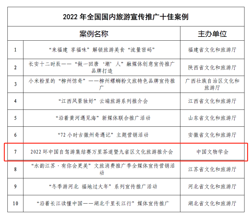由萬(wàn)里茶道聯(lián)合申遺辦策劃,萬(wàn)里茶道沿線(xiàn)九?。▍^(qū))文化和旅游廳(文物局)主辦,萬(wàn)里茶道聯(lián)合申遺辦、中國(guó)文物交流中心、中國(guó)文物學(xué)會(huì)文物旅游專(zhuān)業(yè)委員會(huì)、中國(guó)古跡遺址保護(hù)協(xié)會(huì)文化線(xiàn)路專(zhuān)業(yè)委員會(huì)共同支持,湖北省文物事業(yè)發(fā)展中心、環(huán)中國(guó)自駕游集結(jié)賽組委會(huì)、北京江湖國(guó)際旅游有限公司聯(lián)合承辦,中國(guó)文物學(xué)會(huì)報(bào)送的“2022’萬(wàn)里茶道——環(huán)中國(guó)自駕游集結(jié)賽暨九省區(qū)文化旅游推介會(huì)”獲評(píng)十佳案例(第七名)。