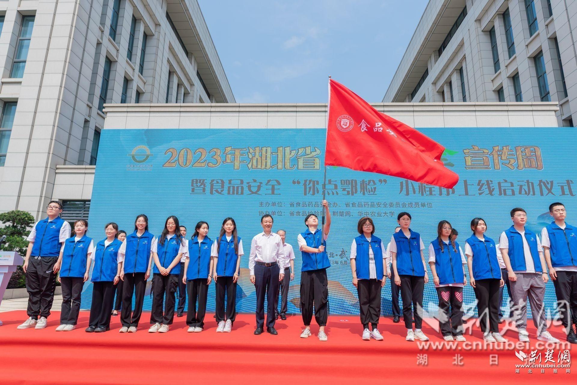 活動(dòng)現(xiàn)場,省政府副秘書長趙俊發(fā)布2023年湖北省食品安全宣傳周暨食品安全“你點(diǎn)鄂檢”小程序正式上線啟動(dòng)命令,向華中農(nóng)業(yè)大學(xué)“食品安全湖北行”社會(huì)實(shí)踐活動(dòng)團(tuán)隊(duì)授旗。