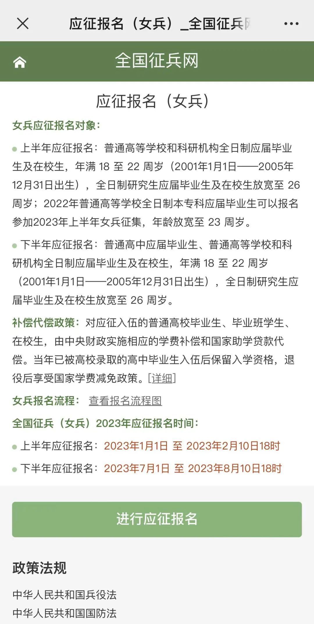根據(jù)征集要求,2023年女兵下半年應(yīng)征報名對象為:普通高中應(yīng)屆畢業(yè)生、普通高等學(xué)校和科研機(jī)構(gòu)全日制應(yīng)屆畢業(yè)生及在校生,年滿18至22周歲(2001年1月1日-2005年12月31日出生);全日制研究生應(yīng)屆畢業(yè)生及在校生放寬至26周歲。