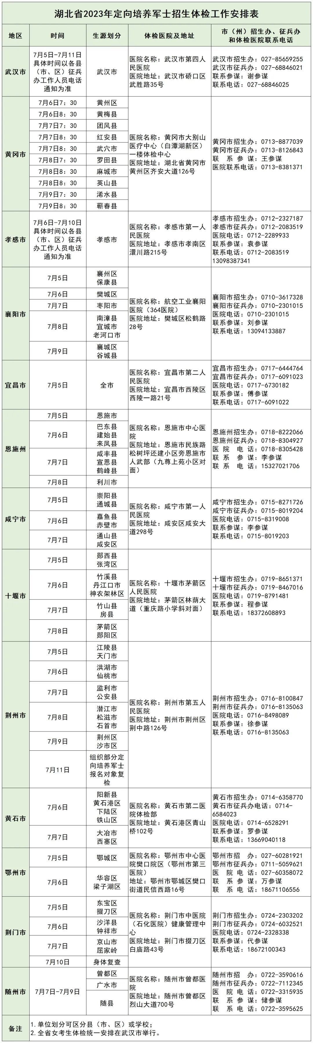 男考生體檢由生源地市(州)征兵辦集中組織實施,女考生體檢由武漢市征兵辦集中組織實施。