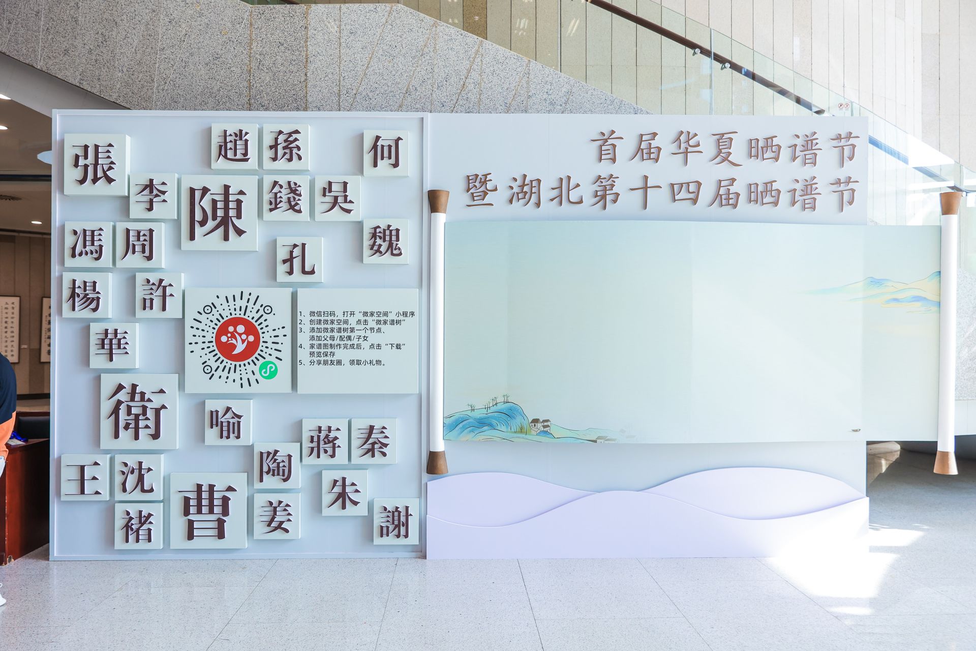 本屆曬譜節(jié)還專門開辟家譜交流區(qū)和讀者互動區(qū),帶領(lǐng)讀者沉浸式感受譜牒文化。全省各地300多位民間家譜收藏家及愛好者慕名前來,紛紛向湖北省圖書館捐譜,現(xiàn)場簽訂捐贈協(xié)議并接受收藏證書。僅開幕式當(dāng)天湖北省圖書館就接受捐贈家譜共計23種61冊。在讀者互動區(qū),國學(xué)經(jīng)典·百家姓描紅、姓氏諧音頭像設(shè)計、姓氏定制書簽和定制禮品等公眾喜聞樂見的活動吸引了大批參與者。姓氏簽到打卡墻前,讀者通過掃碼進入小程序,便可以快速制作出屬于自己的家譜圖。曬譜節(jié)期間,讀者體驗活動將舉辦7場,通過各種沉浸式家譜體驗,拉近讀者與中華優(yōu)秀傳統(tǒng)文化的距離。