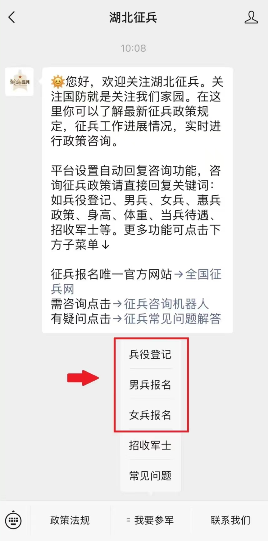 關(guān)注“湖北征兵”公眾號,點擊菜單欄“我要參軍”,直通報名頁面。
