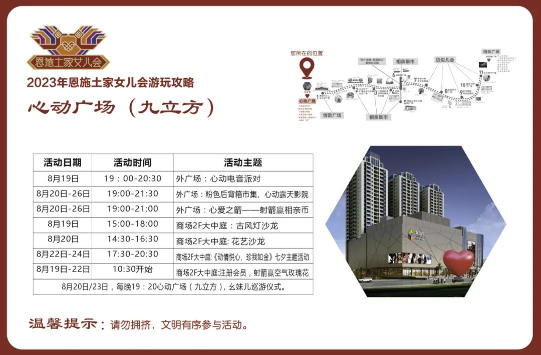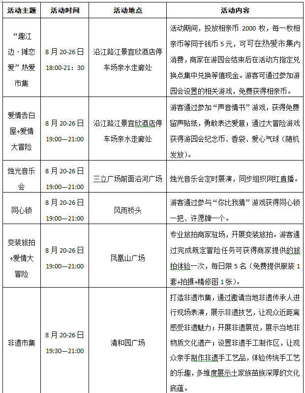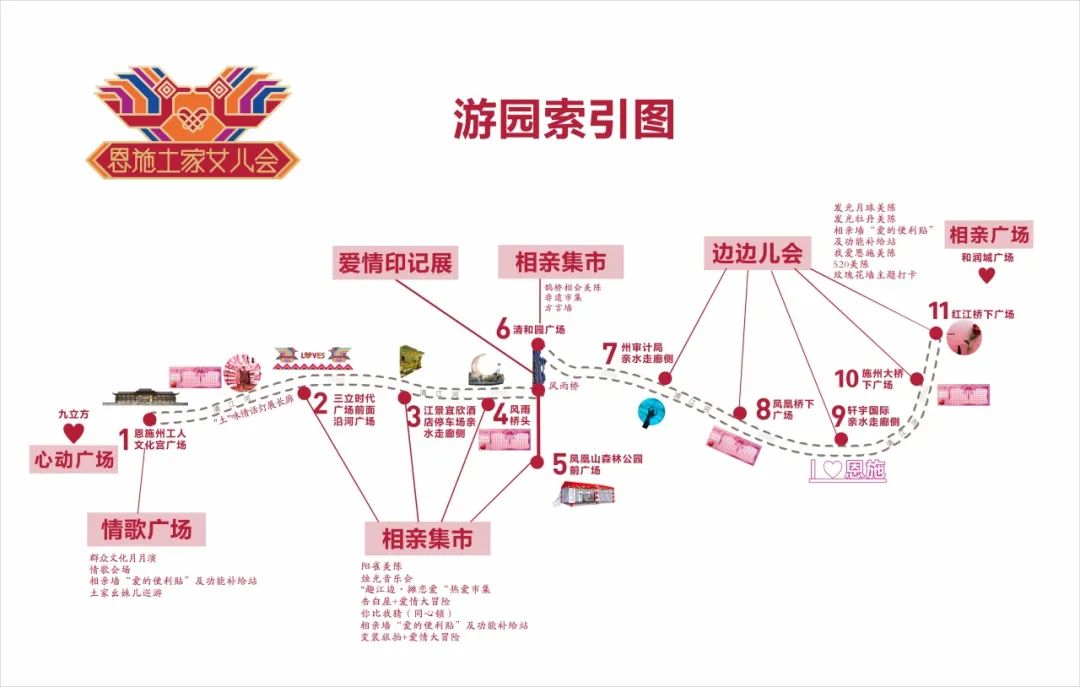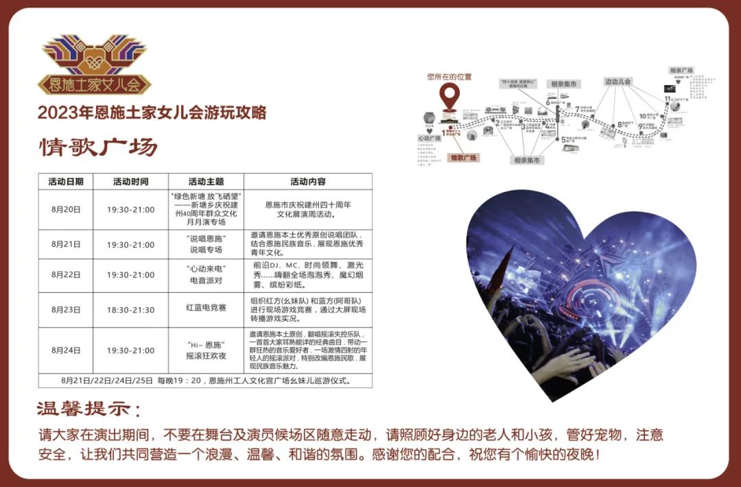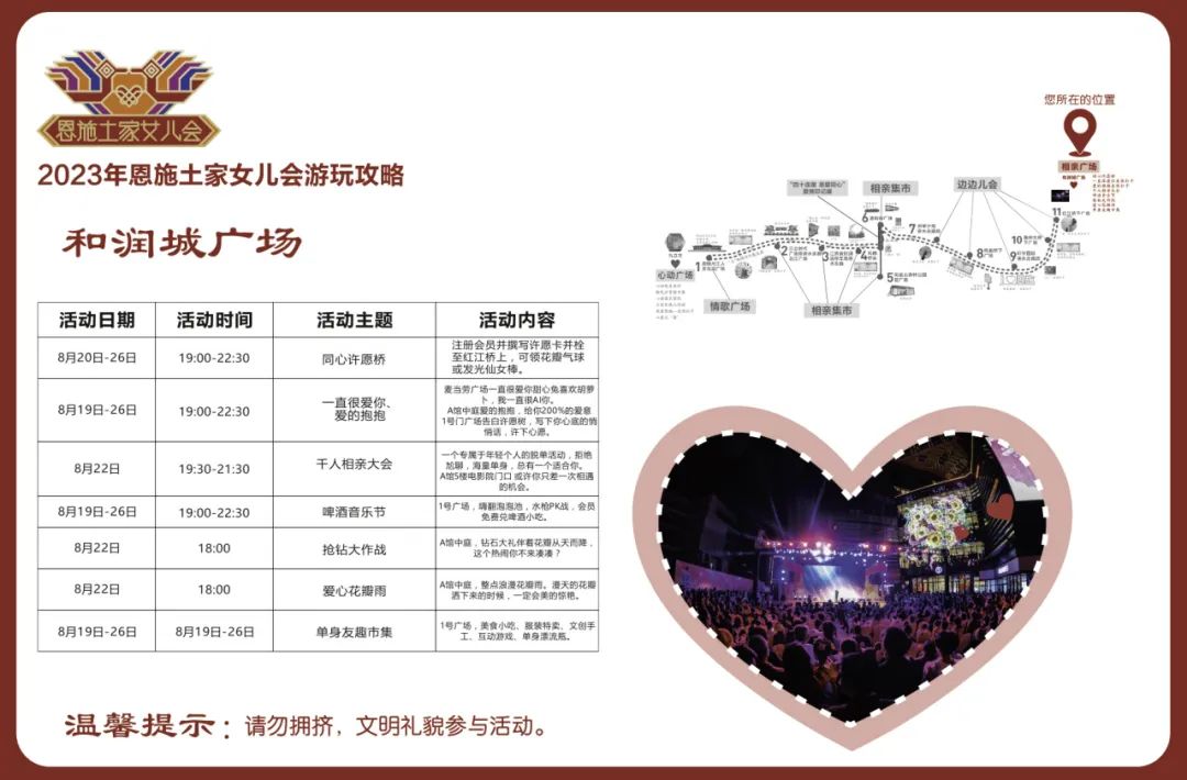 “群眾文化月月演”、“說唱恩施”rap等文藝表演,電音派對、搖滾狂歡、幺妹兒巡游、同心鎖、愛情告白屋、愛情大冒險、非遺市集、相親墻、燭光音樂會、愛情印記展