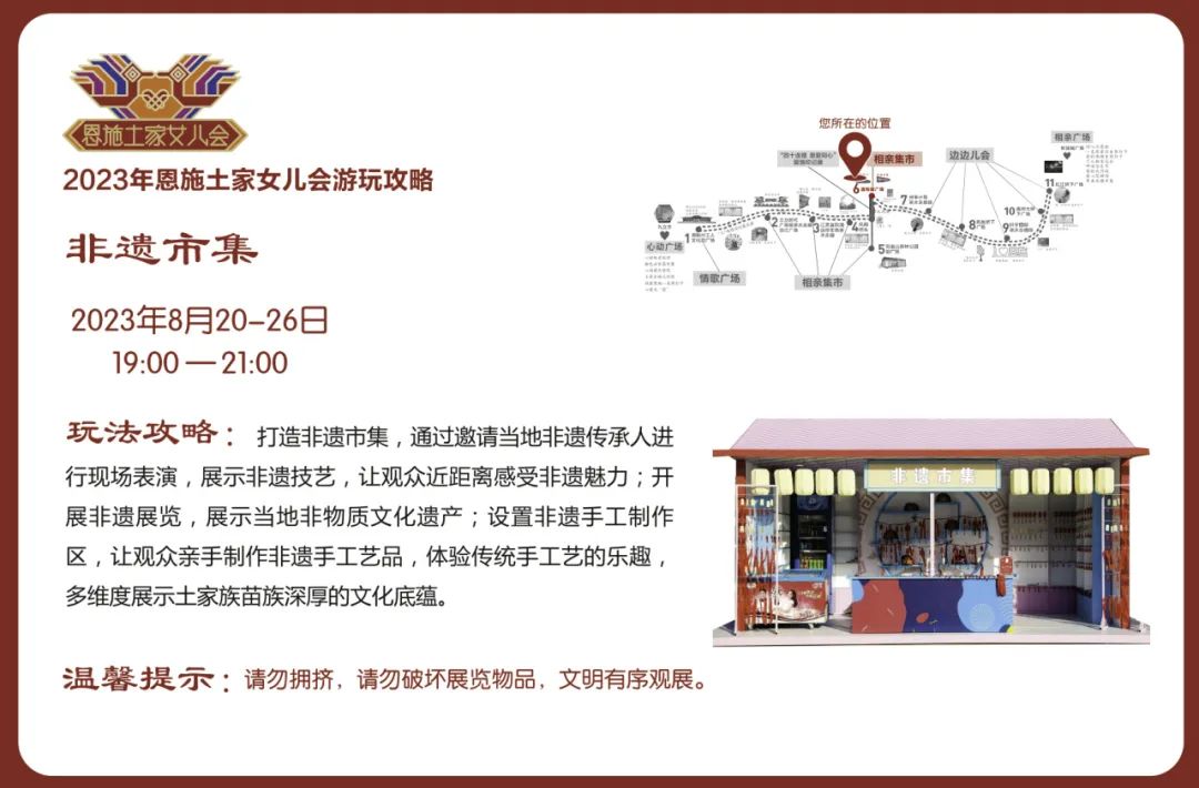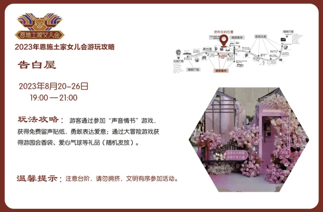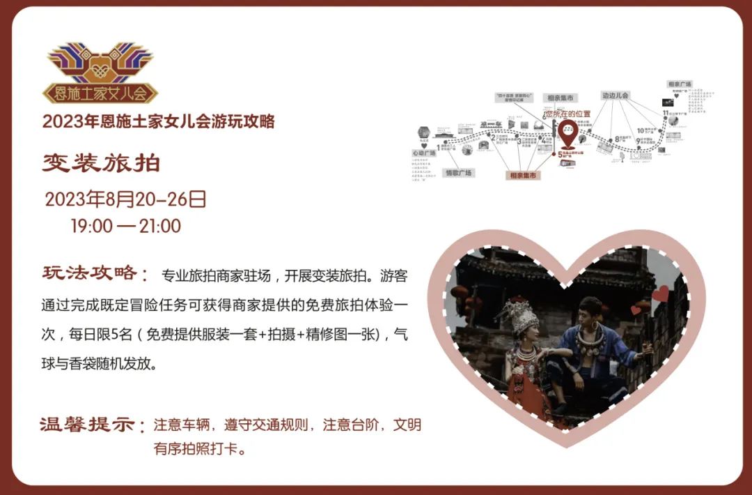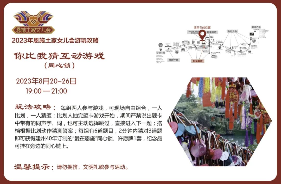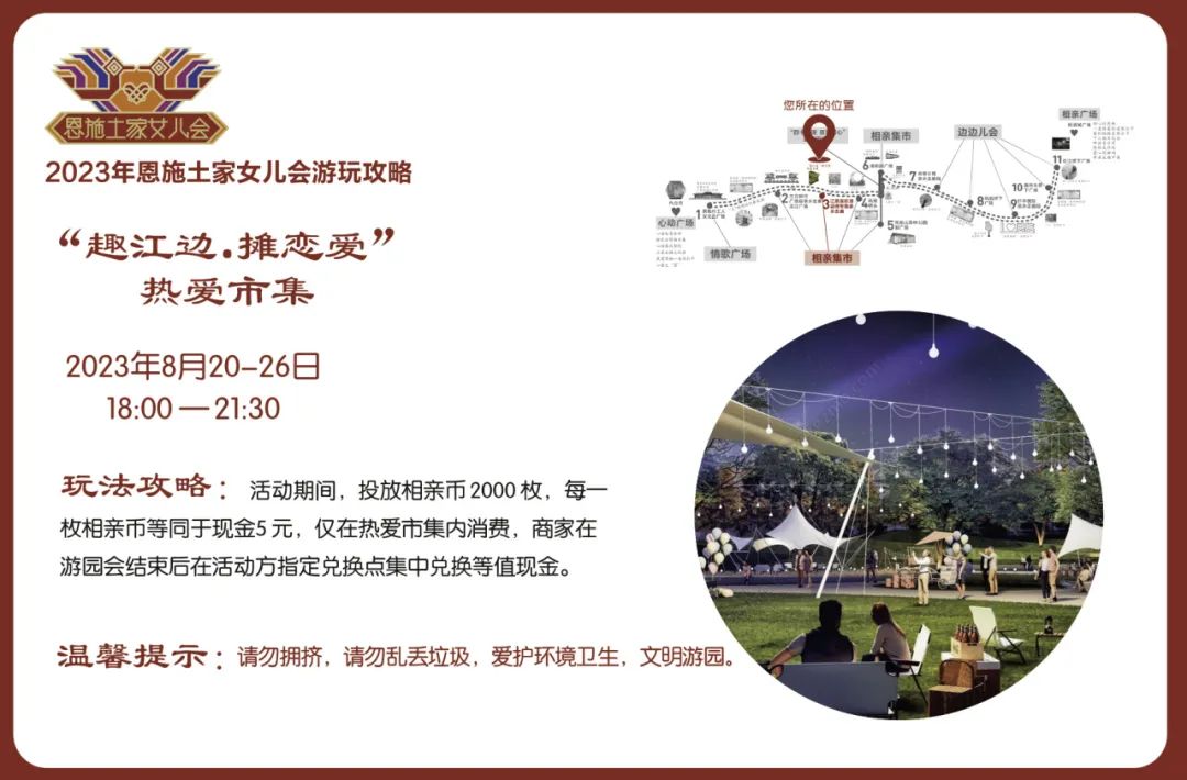 活動內容:恩施新銳市集商家和恩施非遺技藝傳承項目及傳承人,沿途擺攤設點,設置同心鎖、愛情告白屋、幺妹兒巡游、愛情大冒險等游玩項目,打造相親市集,并制作男女款相親幣,用于市集流通,體驗“潮味”女兒會“趕場相親”。