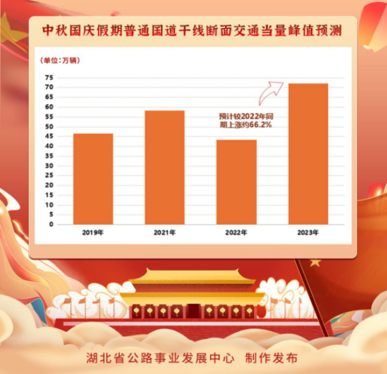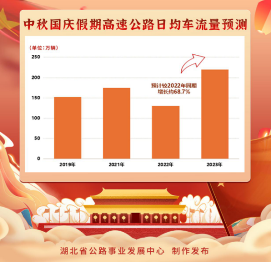 湖北省公路事業(yè)發(fā)展中心通過分析歷年公路網(wǎng)運行數(shù)據(jù),對比近年來中秋國慶期間天氣、車流量等情況,結(jié)合近期全省路網(wǎng)運行實際,預(yù)計節(jié)日期間高速路網(wǎng)通行車輛流量較近期平日日均流量增長約100%,較2022年同期日均流量增長約68.7%。