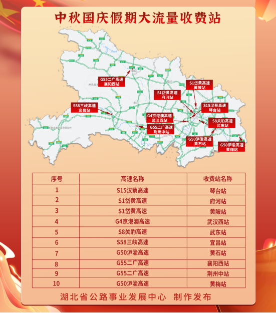 公路網(wǎng)交通流量較為集中的區(qū)域主要有武漢、宜昌、荊州、黃岡和襄陽等地,公眾提前規(guī)劃線路,可避開相關(guān)區(qū)域的高速公路大流量收費站和重點國省干線公路,保障安全、快捷、高效出行。高速公路大流量收費站情況如下: