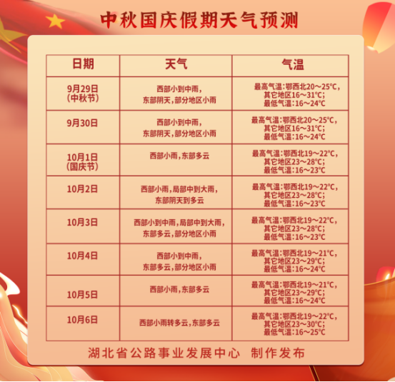 經(jīng)氣象部門研判,預(yù)計2023年中秋國慶期間(9月29日至10月6日),湖北省有兩次降水及弱降溫過程,分別出現(xiàn)在9月29—30日及10月2—4日,其它時段西部以陰雨為主,東部以多云為主;10月6日早晨部分路段可能有大霧。鑒于西部地區(qū)前期降水偏多,中秋國慶假期仍以陰雨為主,西部地區(qū)需加強防范邊坡滑坡等地質(zhì)災(zāi)害及降雨造成的低能見度對交通安全的影響,東部地區(qū)需關(guān)注6日早晨可能出現(xiàn)大霧天氣。具體預(yù)報如下: