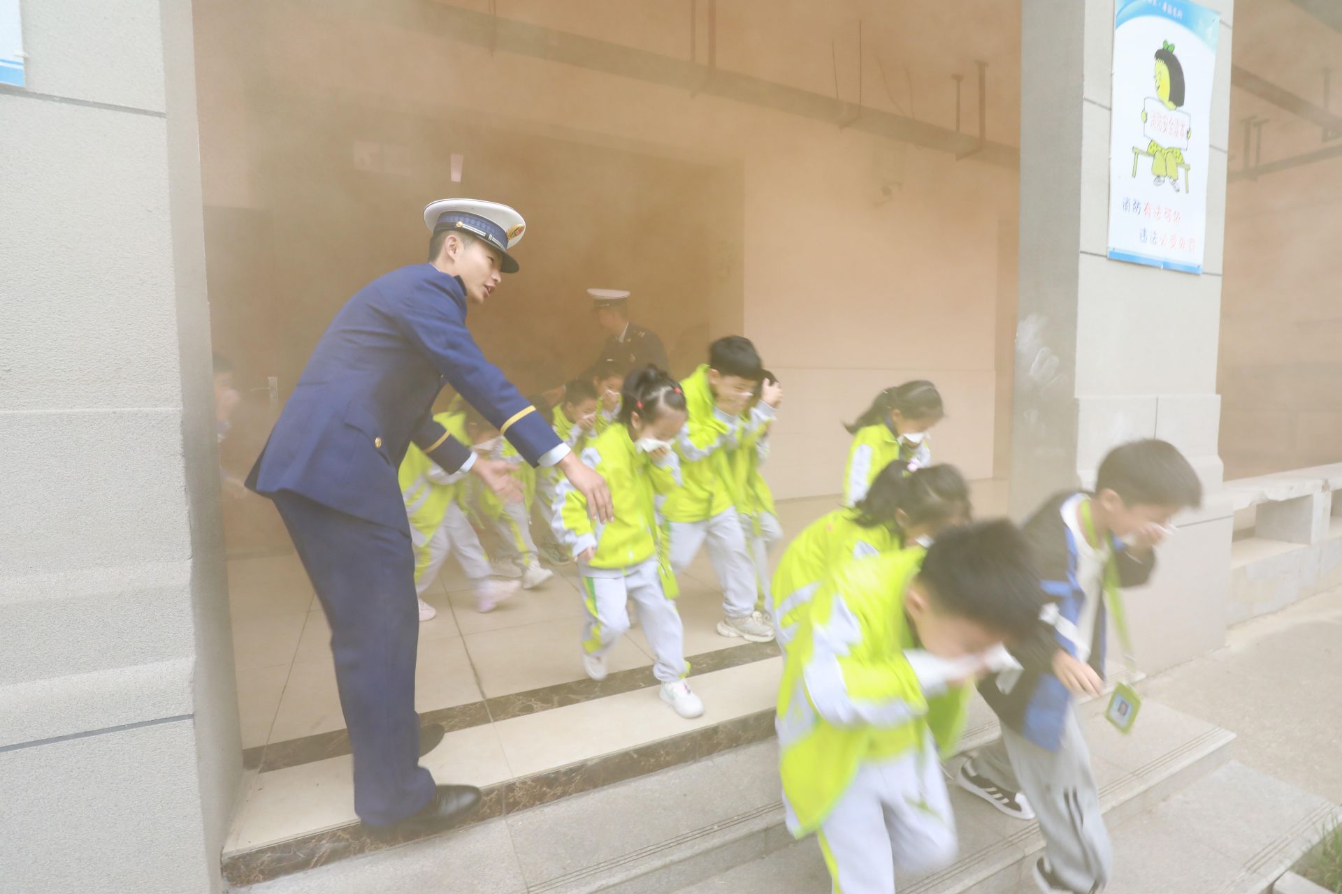 上午9點40分,學校各場地、各樓道定點安全責任人就位。煙霧彈投放員在指定地點待命。警報拉響,演練正式開始。