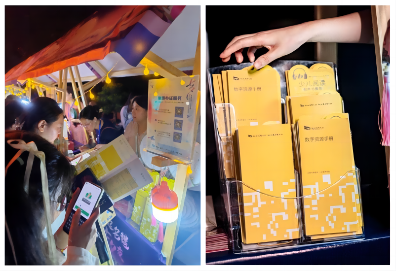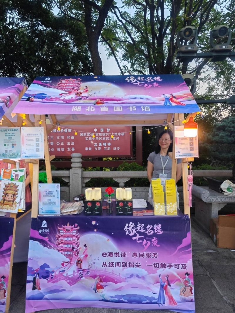 湖北省圖書館工作人員手持資源手冊向游客熱情介紹湖北數(shù)字圖書館的豐富數(shù)字資源,引導(dǎo)市民現(xiàn)場免費辦理電子讀者證,組織現(xiàn)場情侶參與碼上猜書互動游戲,讓他們在輕松愉快的氛圍中感受到 “從紙間到指尖,一切觸手可及”的數(shù)智魅力?;顒蝇F(xiàn)場,工作人員還向體驗服務(wù)、參與游戲的游客贈送書簽、書燈、積木玫瑰等紀(jì)念品,為他們帶去美好的七夕祝福。