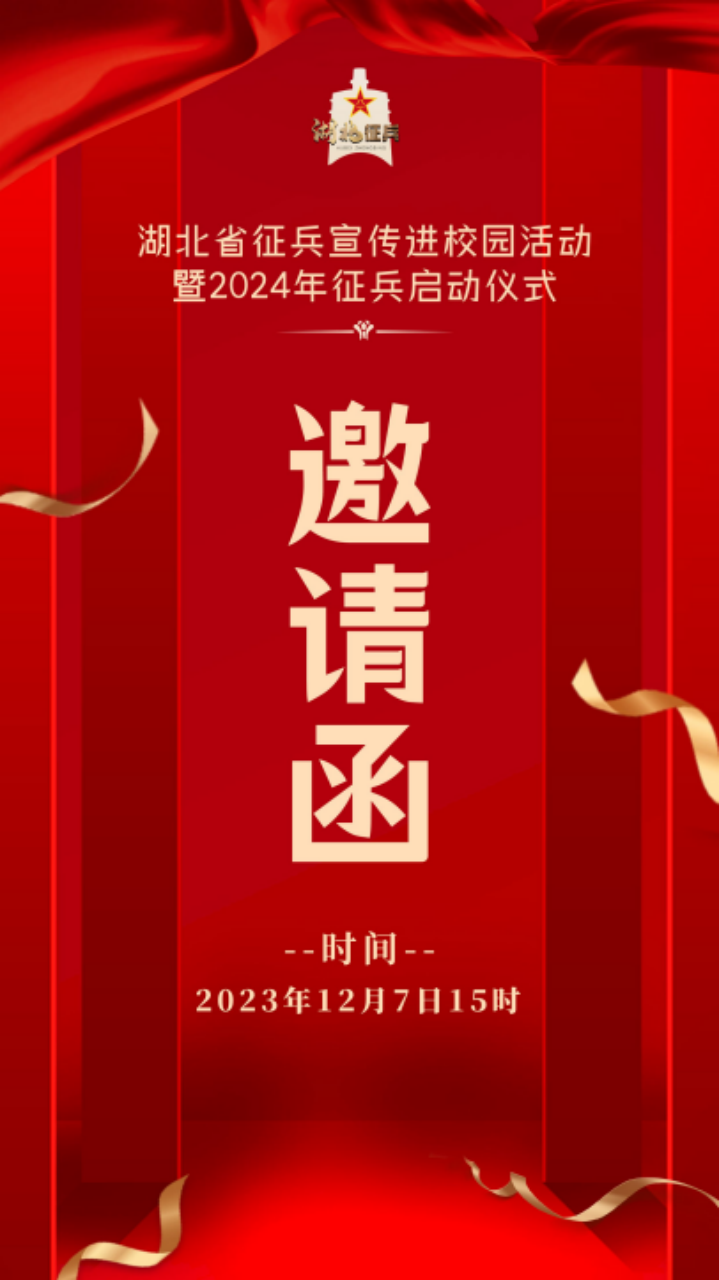2023年12月7日15時,由湖北省人民政府征兵辦公室主辦的“湖北省征兵宣傳進校園活動暨2024年征兵啟動儀式”將正式舉辦。