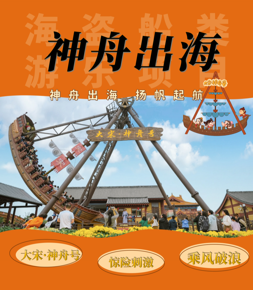 “神舟出海”游樂項目復原了大宋官方使臣出使海外國家的“神舟”,你可乘坐“大宋·神舟號”與大宋使臣一起揚帆起航、乘風破浪!