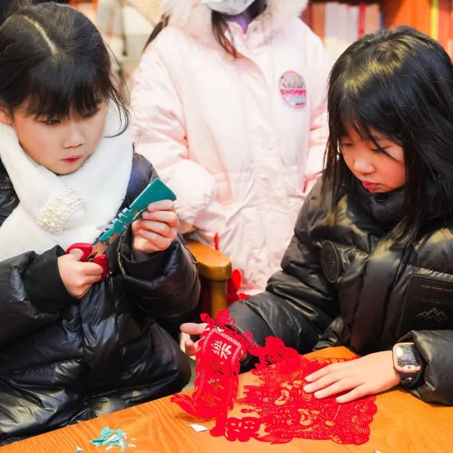 在紅巷書屋窗花區(qū),前來領(lǐng)窗花的人排起了長(zhǎng)龍,觀眾們將辭舊迎新、接福納祥的愿望寄托在一幅幅年味十足的剪紙中。