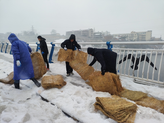 2月22日上午,在東洲橋路段掃雪現(xiàn)場,赤壁市建工集團(tuán)工作人員正頂風(fēng)冒雪手持鐵鍬、雪鏟等清掃工具,鏟除橋梁上的積雪,鋪設(shè)草毯防滑。