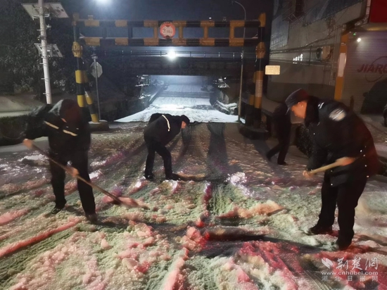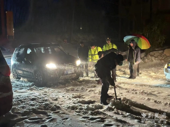赤壁市公安局民警立即冒雪進(jìn)行救助,最大限度為受困受阻車輛司乘人員提供幫助。同時對路面進(jìn)行緊急清理,消除安全隱患,現(xiàn)場疏導(dǎo)車流,確保盡快恢復(fù)正常通行。