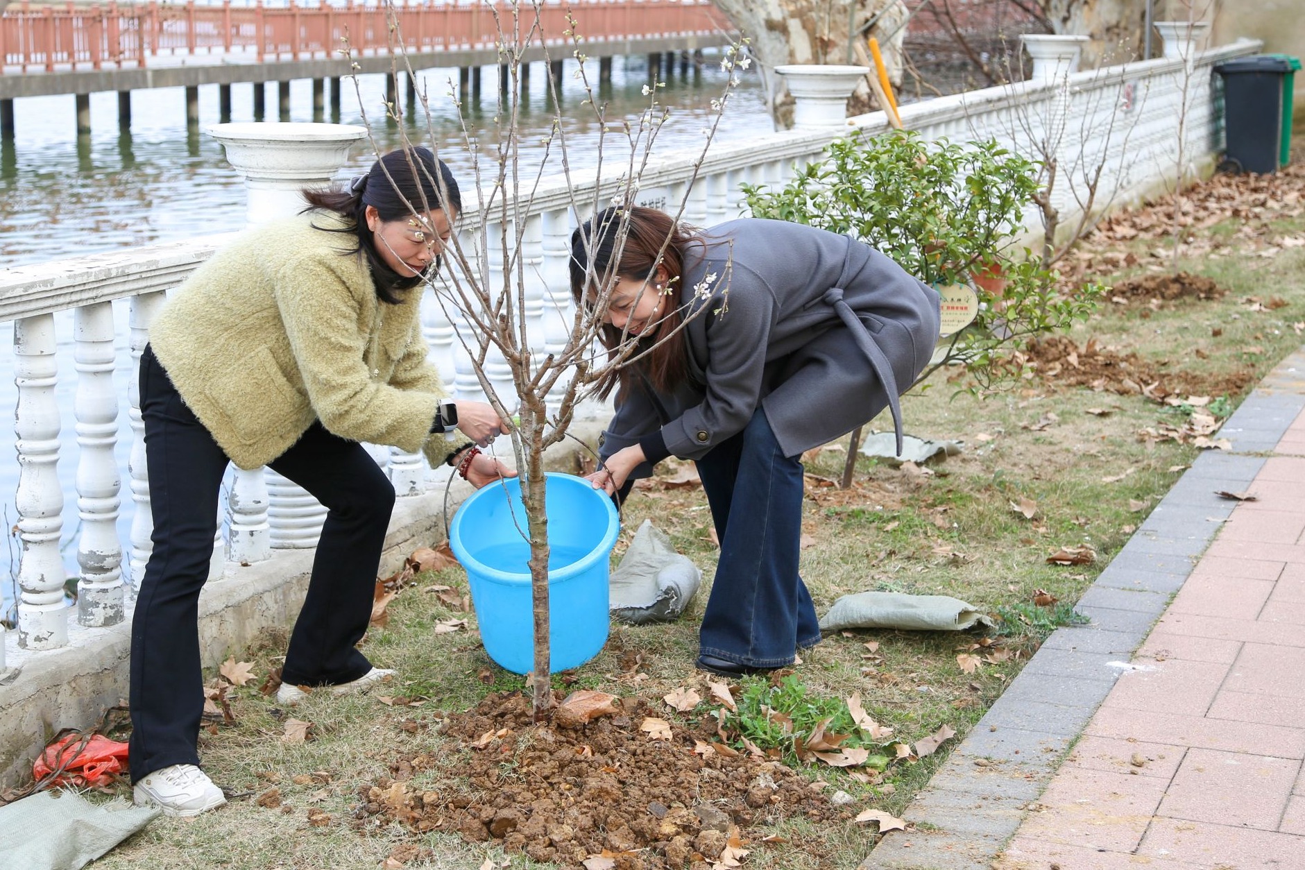 植樹地點選在單位后院花園,活動規(guī)模不大,但現(xiàn)場氣氛很活躍。大家笑意盎然,揮鋤培新土,施肥育根基,澆水潤新枝。經(jīng)過半小時的精心栽種,六棵樹苗傲然挺立在草坪上,為花園增添了一抹欣欣向榮的綠意。