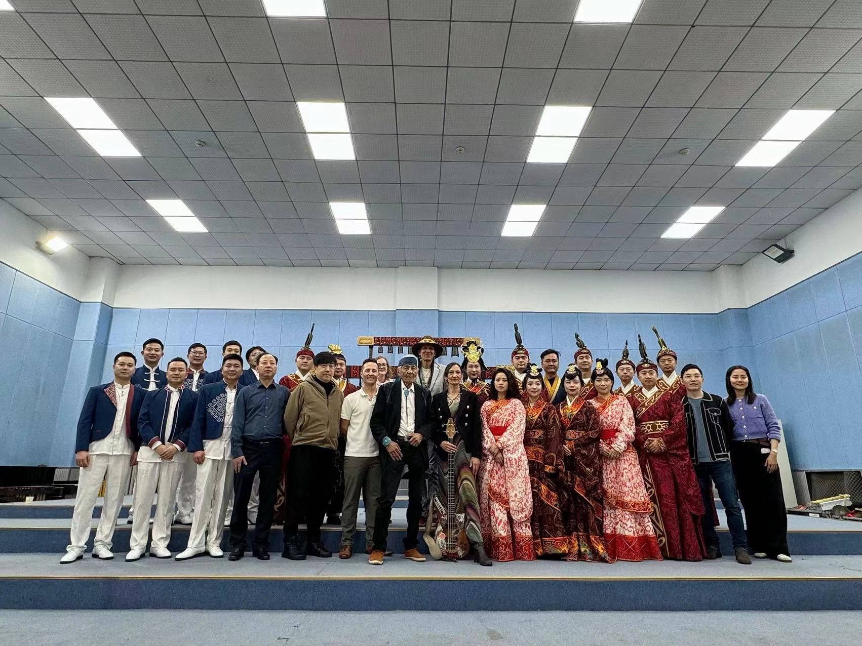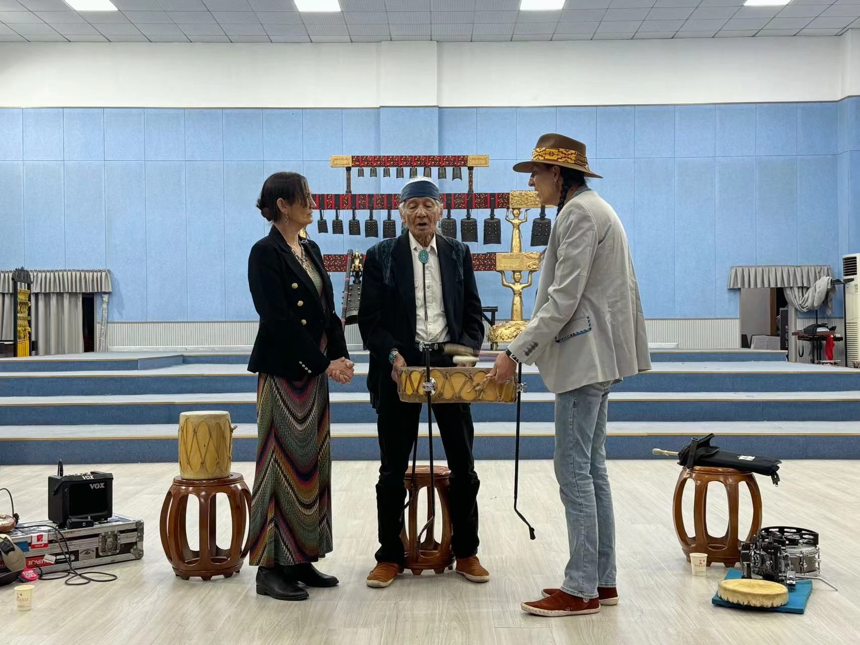 活動最后,Sihasin樂隊不僅帶來了極具迪內(nèi)納瓦霍特色的歌舞表演,還邀請現(xiàn)場所有演員上臺進行即興創(chuàng)作。大家圍成一個圓,悠揚的琴聲與貝斯聲完美融合,歌聲此起彼伏,中美音樂文化的交融將現(xiàn)場的氣氛推向了高潮。