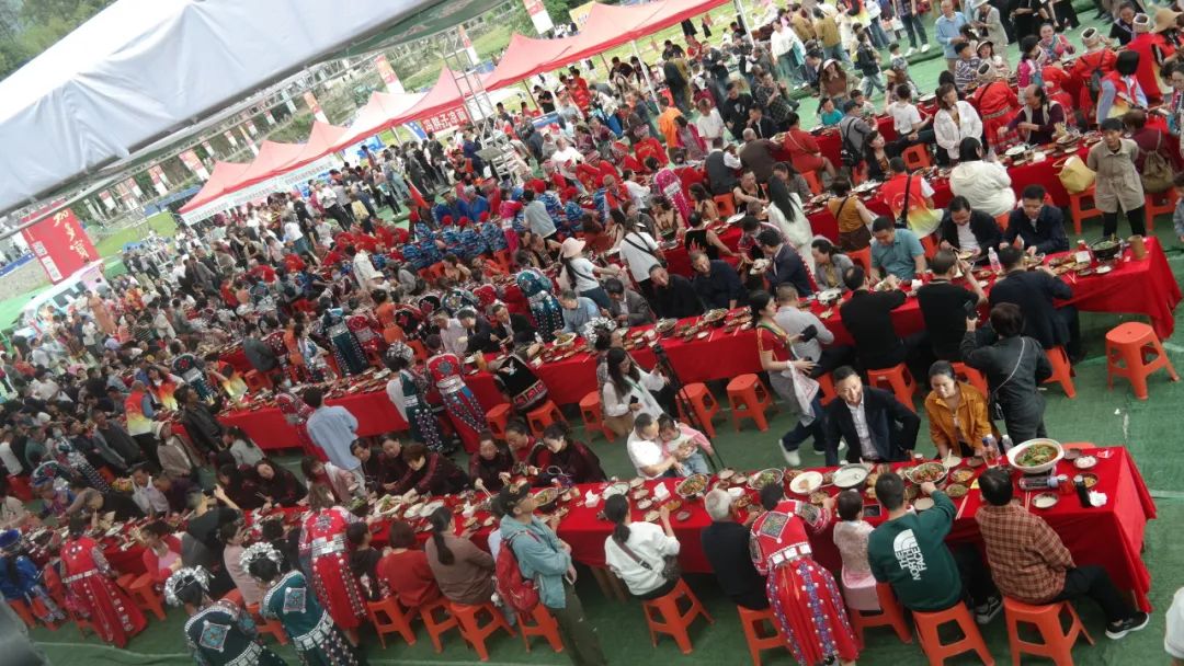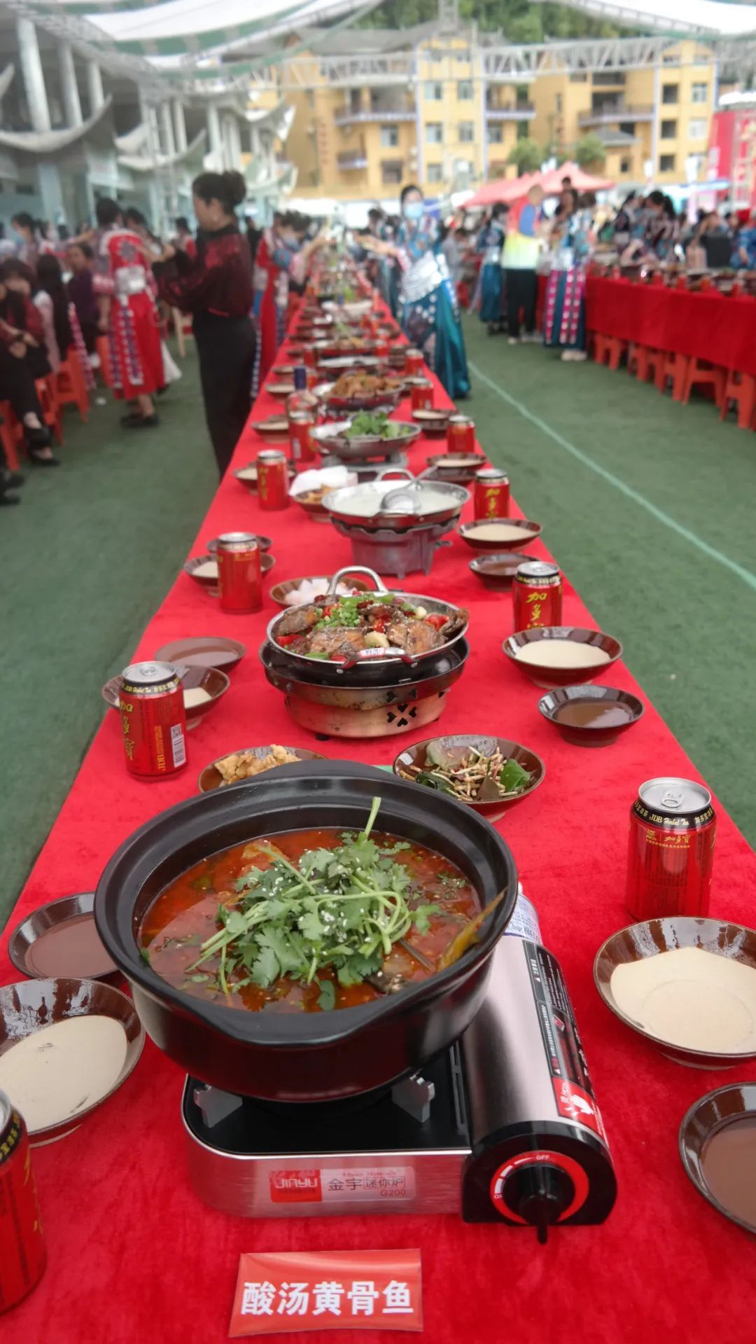 長桌宴由150張桌子拼接而成,兩側(cè)擺放座位共600個。“臘豬蹄”“肉末合渣”“燉土雞”“硒土豆”等各種讓眼垂涎欲滴的恩施特色美食擺放上桌。大家圍桌而坐,在感受長桌盛宴的同時,各鄉(xiāng)鎮(zhèn)非遺傳承人、民間藝人爭相一展歌喉,讓現(xiàn)場觀眾在曲調(diào)優(yōu)美、民族風(fēng)韻濃郁的民歌聲中喝著侗鄉(xiāng)米酒、品特色美食,感受侗鄉(xiāng)人的幸福生活,現(xiàn)場一片歡騰。