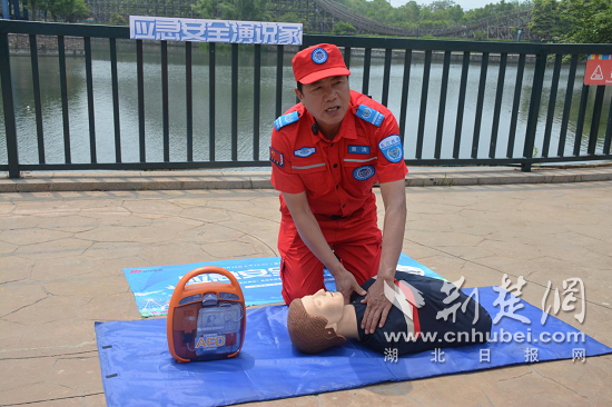 蔡濤還現(xiàn)場示范了自動體外除顫儀AED的操作流程和注意事項?!癆ED除顫儀按下通電按鈕后立刻遠離患者,患者胸部如有汗水需快速擦干,因為水會降低AED功效。”